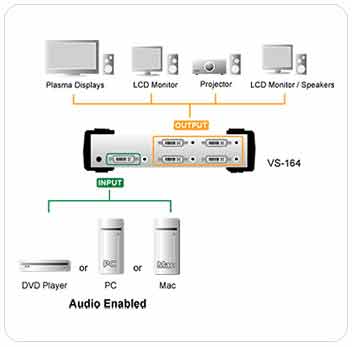 VS164 DVI視訊分享器能將所接收的DVI視訊及音訊訊號,透過複製和增強,再提供4組DVI視訊和音訊訊號輸出,是廣播環境、課堂教室或重度使用者的最理想選擇。