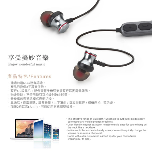 特色 .檢磁型號:BH002 .NCC:CCAM17LP1384T0 .通過台灣NCC協會認證。 .產品已投保3千萬責任險。 .藍牙4.2版晶片,部分智慧手機可支援藍牙耳麥電量顯示。 .磁吸設計,不使用時可互相吸附防止脫落。 .音樂播放與通話模式自動切換。 .具通話 / 來電接聽 / 調整音量 / 上下選曲 / 播放與暫停 . / 相機自拍...等功能。 .加贈2組耳套(大.小),可依使用狀態調整替換。 .中英文語言切換 .藍牙電量顯示 .※請勿連續充電超過3小時,以免內建電池損壞。