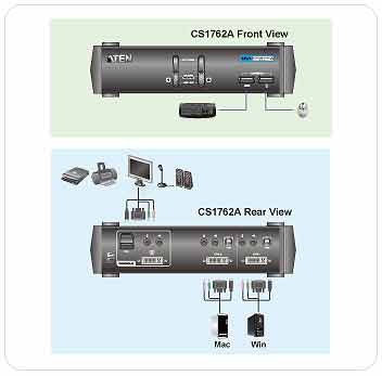 CubiQ CS1762A USB DVI KVMP?多電腦切換器的推出,為KVM(鍵盤、螢幕 、滑鼠)產品功能創造了革命性的新方向。CS1762A除了同時整合2埠USB 2.0Hub與2埠KVM多電腦切換器之外,並提供支援數位螢幕的DVI介面。CS1762A具備ATEN創新的Video Dynasync?螢幕動態同步顯示技術,可保持最佳螢幕顯示解析度。該產品同時支援電源開啟偵測功能,若其中一台電腦電源關閉,CS1762A會自動切換至下一台電源開啟的電腦。