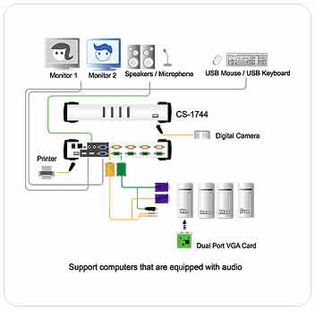 CS1744 4埠KVM 切換器整合視訊雙輸出與USB KVMP切換器功能,讓支援雙螢幕顯示的電腦,可以透過一組USB鍵盤及滑鼠,與兩組VGA/ SVGA/Multisync 顯示器搭配控制。此外,CS1744提供前後各1組USB連接埠功能,可讓每台伺服器電腦主機分享使用接續到這連接埠的任何一個USB週邊裝置。
