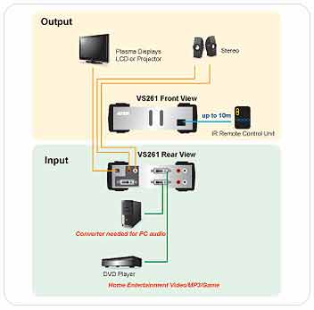 VS261為2埠視訊切換器,其結合了DVI(Digital Visual Interface)介面的視訊切換功能與高品質的立體音效,為多媒體的功能運用建構了開創性的新方向。