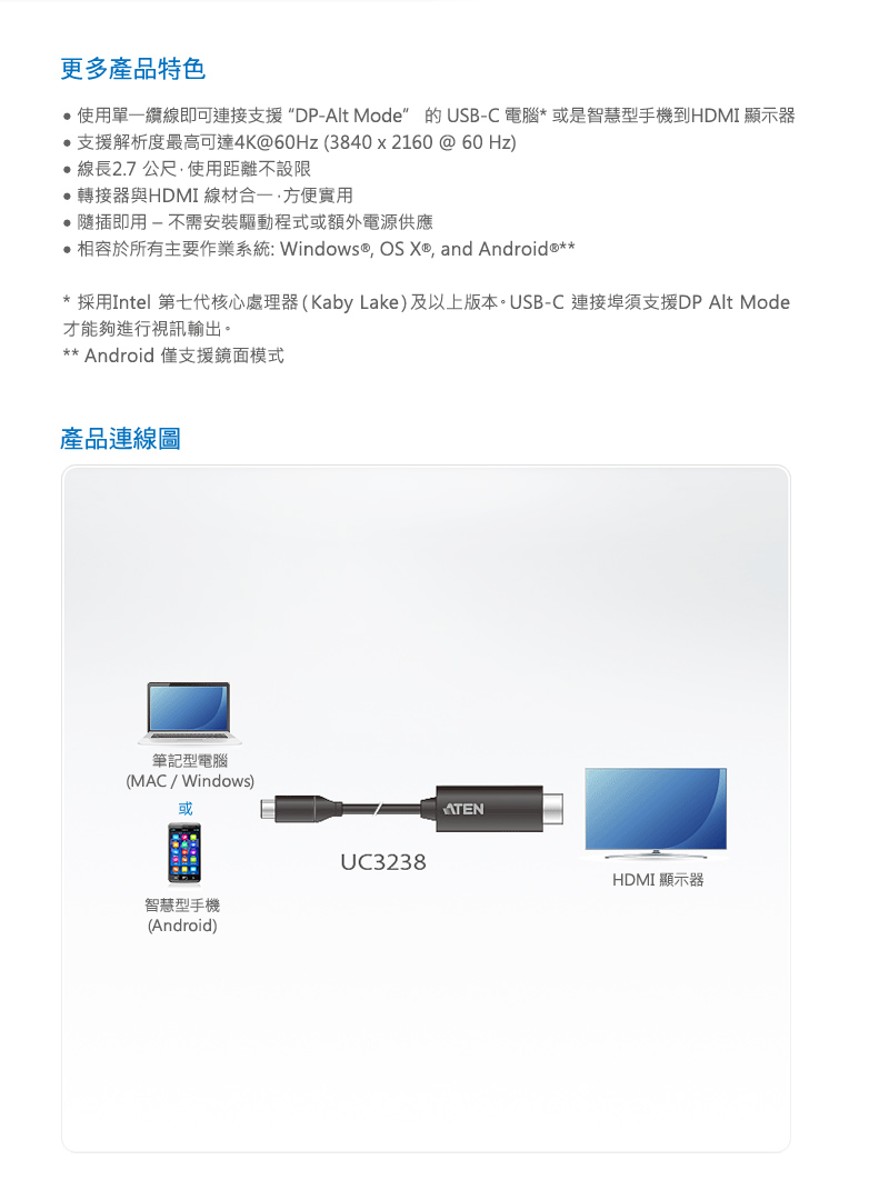 ATEN USB-C 轉 4K HDMI 轉接線 (